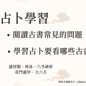 占卜學習要讀哪些古書?常見的問題解答這支影片我會跟大家分享在學習占卜時,閱讀古書的常見問題,學習占卜大致上會接觸哪些古書,這些書的優缺點是什麼。種類涵蓋周易、六爻神卦、奇門遁甲、大六壬會提這麼多是因為我覺得你一開始可以都了解一點,隨便看看,先有個輪廓再說,你也可以點選章節,只看你感興趣的部分目錄00:00開始00:42古書實際上不是寫給新手看的02:29現代占卜教學書的常見問題03:42文言文的常見問題08:50分類占不符合時代需求,特別是女占感情14:35結構鬆散,缺乏系統或定義不清、理象神煞混雜,觀點前後矛盾16:42解決方法18:57通用類書籍介紹《五行大義》《六壬神定經》《協記辯方書》25:39周易書籍介紹《易經》《周易本義》《易傳與十翼》29:57卜卦與六爻書籍《增刪卜易》《卜筮正宗》《黃金策》36:36奇門遁甲書籍介紹《御定奇門寶鑒》《奇門遁甲秘笈大全》《奇門統宗》《奇門五總龜》43:13大六壬書籍介紹《六壬大全》《御定六壬直指》《壬歸》《斷案》《指南》《占事略決》《壬占匯選》《壬學瑣記》