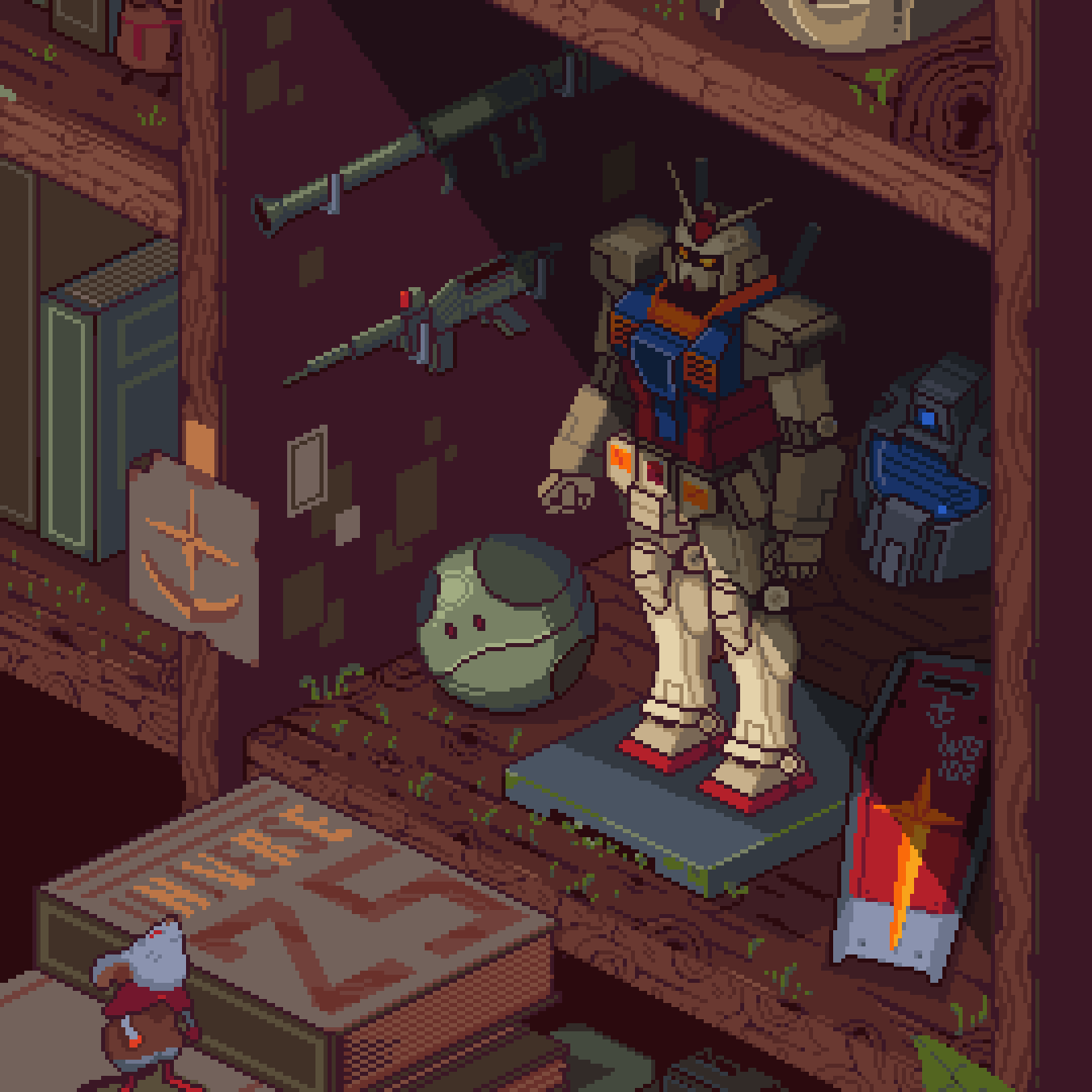 「小老鼠抬頭望著櫃子上的模型,彷彿闖入一座古老神殿,那些巨大的塑膠雕像在牠眼中,或許正是遠古巨人們所敬奉的神明。」