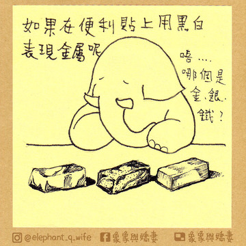 巴友路加畫了一個日本論壇的題材挑戰就是用黑白的方式畫出金、銀、鐵三種材質的塊體路加在留言回覆說要不要玩一下一開始並沒有畫的動機但是後來想到用便利貼不知道會畫出什麼樣子尺寸小而且只能硬筆筆觸覺得有一塊表現得不理想答案下拉揭曉