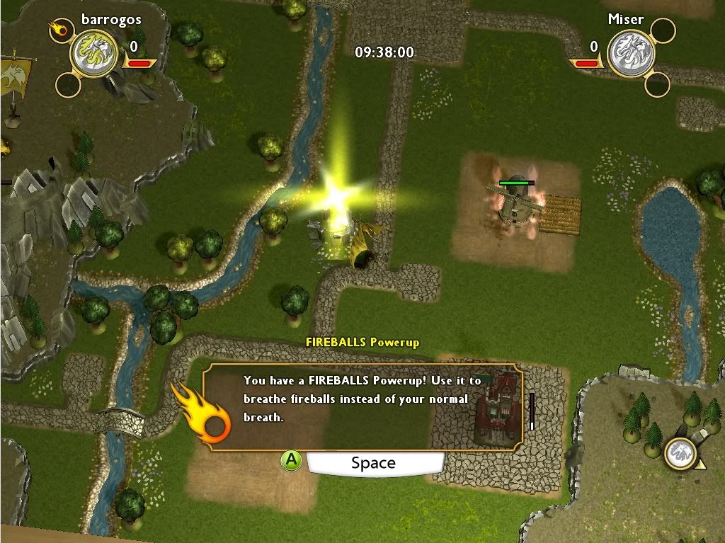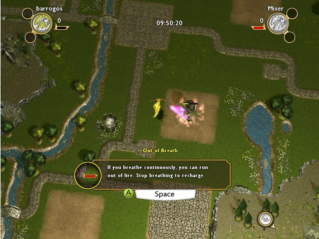 按住滑鼠左鍵可以對建築物或人噴火,飛龍頭像旁邊的紅色條就是你的吐息能量,如果用光了就必須稍微等一下才能繼續噴火(恢復的速度還蠻快的)