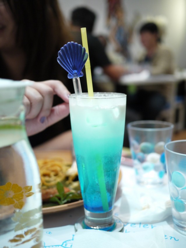 這是客廳,藍白充斥的風格,讓人心情好愉悅XD 牆壁上有一些彩繪,也是店家的用心。