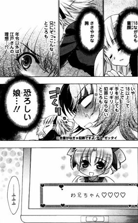 原本以為看這本之前,被我朋友這麼一講,還以為很多H圖,事實上只有少許的洗澡露點畫面而已,我相信平常看正常向動畫無修正看習慣的人,這部的口味沒想像中重就是了,真的有興趣不用擔心可以買來看,而且黑化妹妹與在哥哥面前裝天真的妹妹這種反差萌也滿好玩的,哥哥整天對著妹妹妄想的妹控與道德倫理怒吼掙扎也是可看之處。