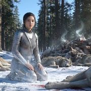 黃褐色微捲髮在肩膀披散著,與男主角凱薩對戲時那一頻一笑,