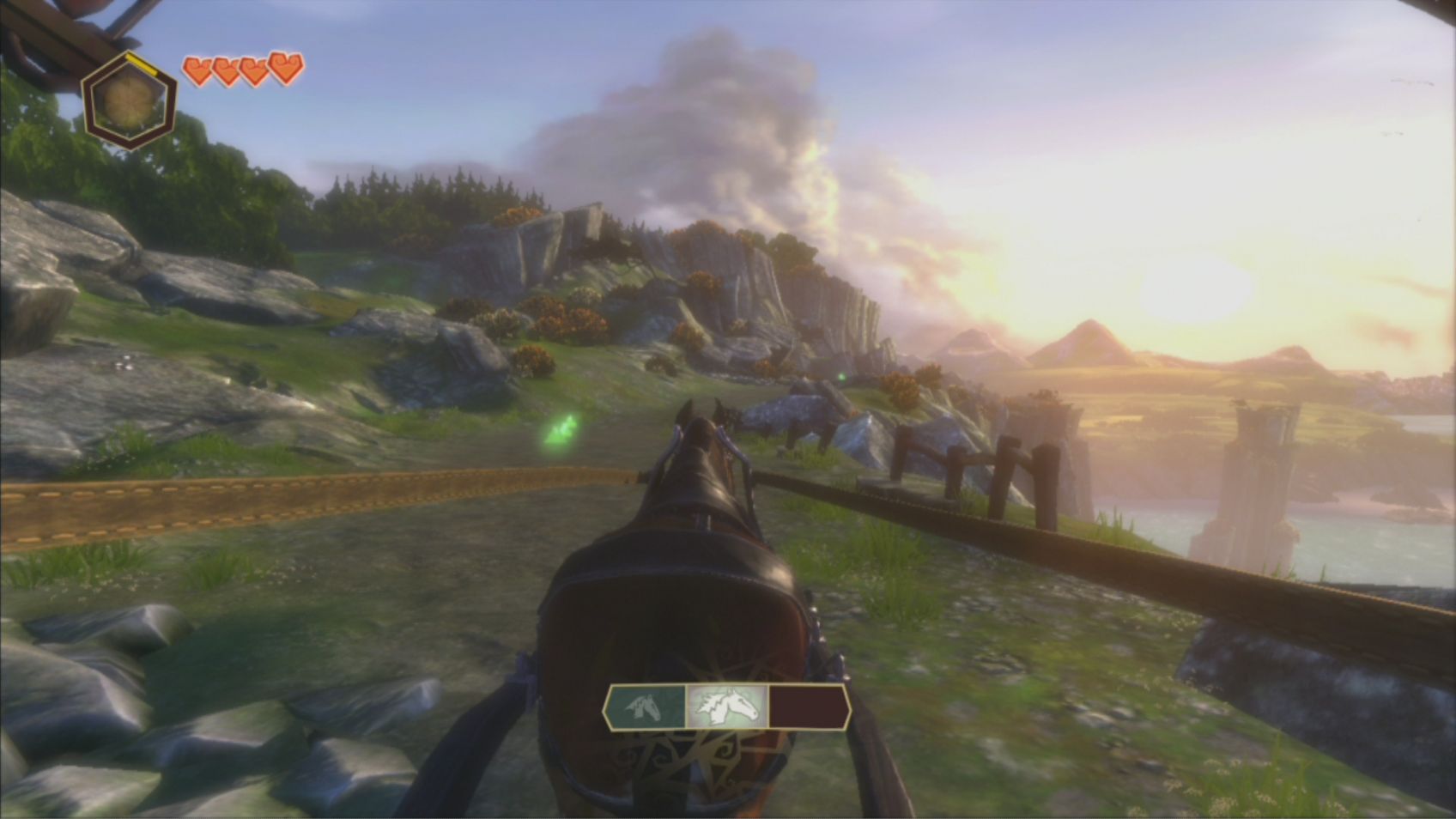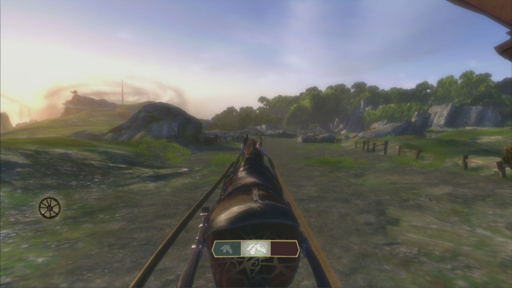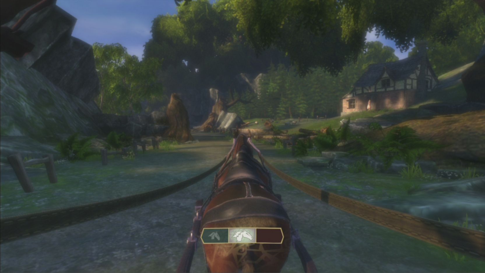 旅途中除了不停在碎碎念的老先知外,另一個賽倫了!遊戲接近有一半的時間都是在騎馬的狀態,所以馬匹的健康可是很重要的,每過一段旅途後就可以道路旁的驛站,替賽倫療療傷、擦擦馬身、或著是摘一旁果樹上的水果。在旅途你有機會遭遇到相當多的攻擊,你可能就必須一邊疾駛著馬車,一邊使用法術攻擊敵人。而在鄉間小路時你也得小心被衝下山谷了。旅途當中不要忘了一邊欣賞阿爾比恩壯闊的風景,製作小組可是在這方面下了不少苦心。