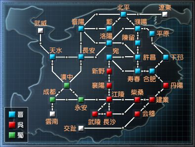 ●晉 主要都市:洛陽 戰略目標都市:丹陽 初期所属武将:司馬懿(君主)、司馬師、司馬昭、鄧艾、蔡文姫、王元姫、諸葛誕、夏侯霸、郭淮、鍾會