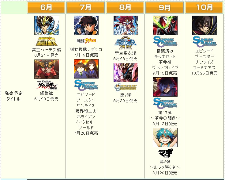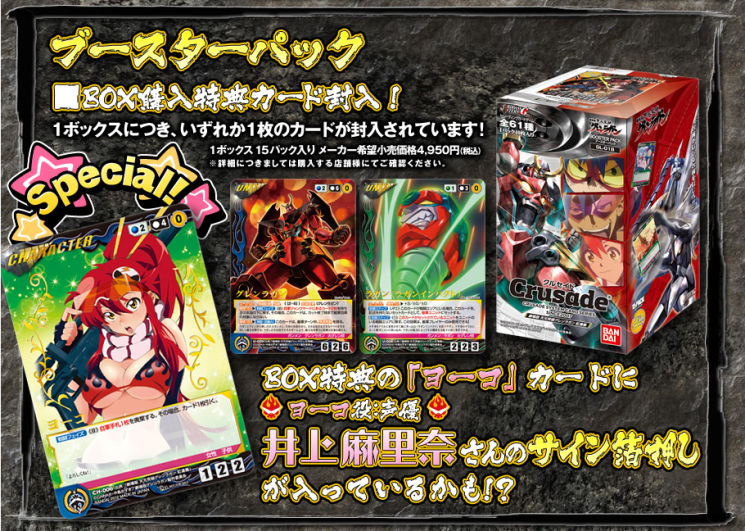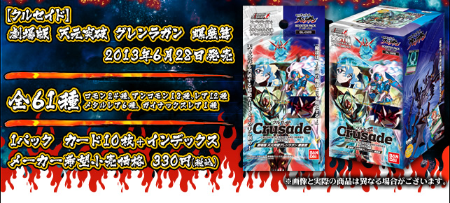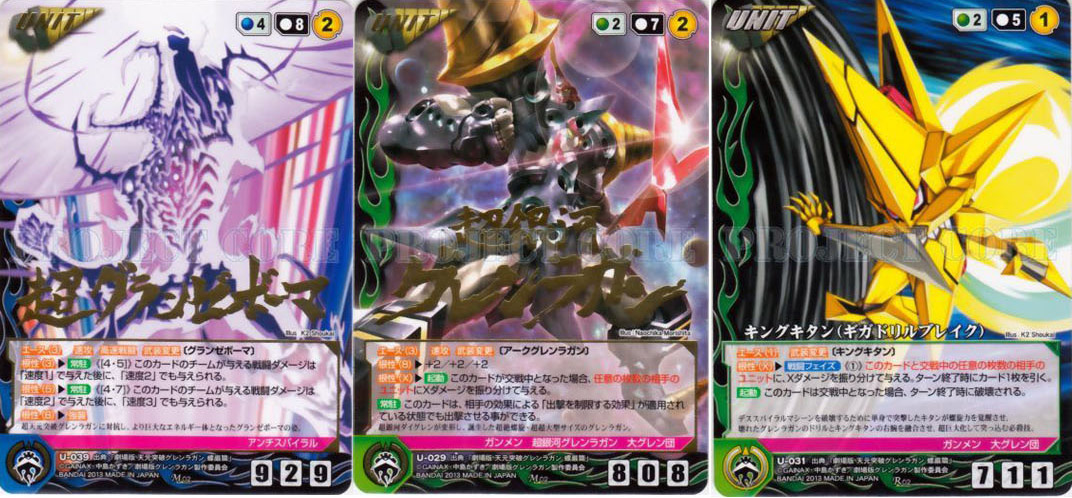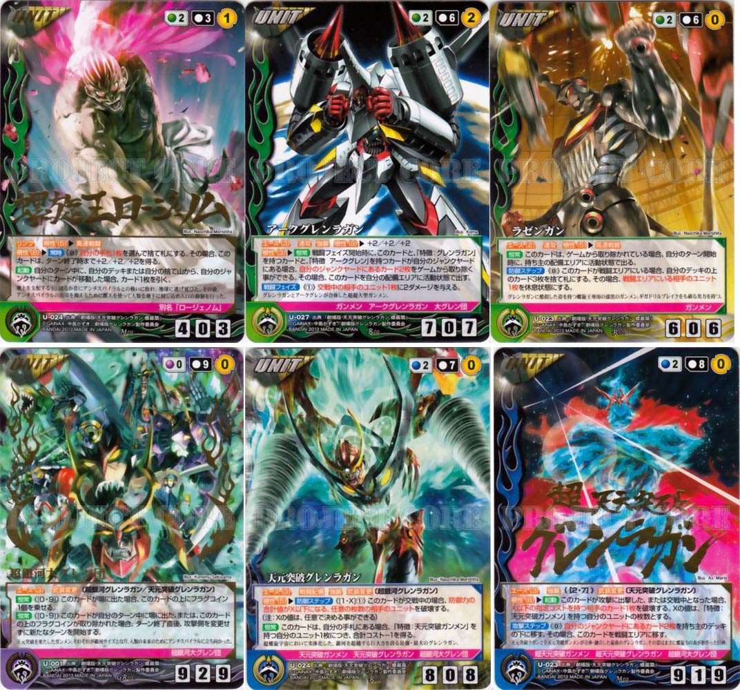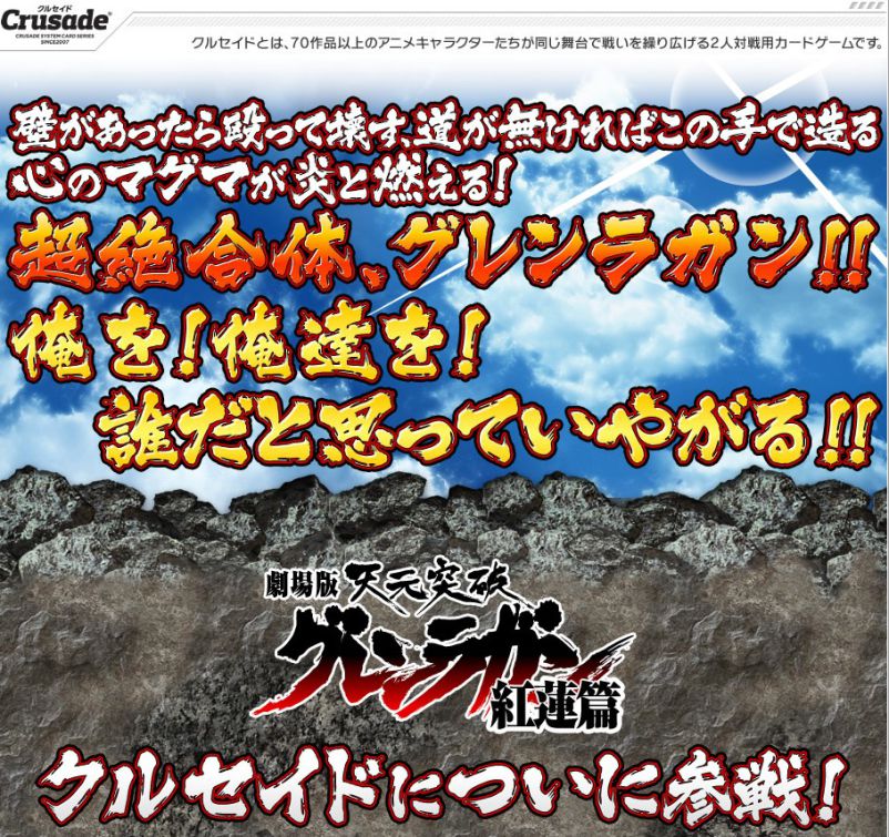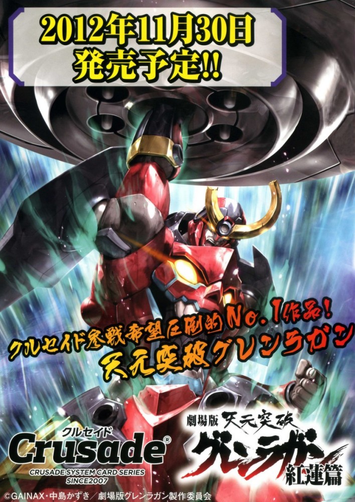 GAINAX的機器人系列作品終於參戰拉!!!官方海報上寫到CRUSADE參戰希望壓倒的NO.1 作品天元突破グレンラガン,官方終於聽到了! 讓我歡喜高興的程度跟當初DYNAMIC CRUSADE(永井豪系列)參戰一樣,DECK組成方面可以跟トップをねらえ!/トップをねらえ2!同樣是GAINAX旗下的作品做混和組成,目前CRUSADE DECK組成規則是以作品(同公司或是同作品系列)系列作為主要構成。