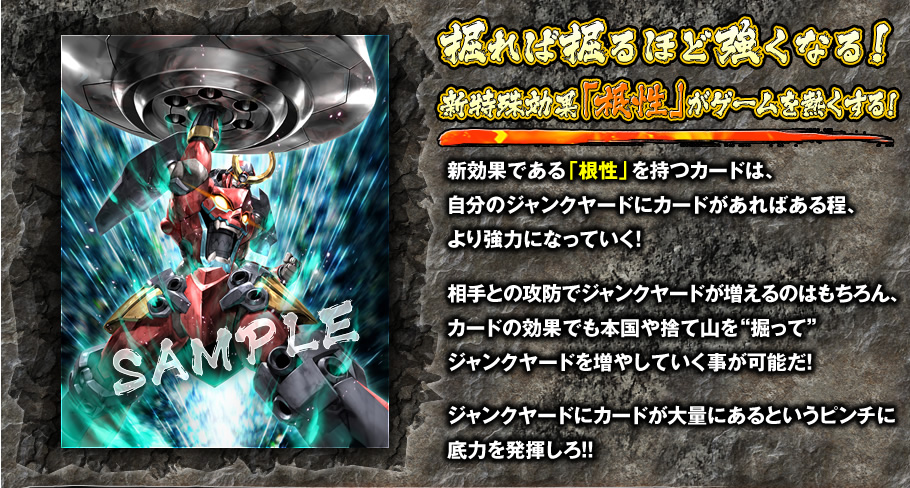 在天元突破グレンラガン往後系列的上增加了!GAINAX經典的根性為特殊效果,根據墓地的卡片數發動效果或是啟動更強的效果,當然也不忘使用效果合體加速叫出強力機體出來,在這次劇場版 天元突破グレンラガン 螺巌篇發售後大大強化合體加速出強力機體,可以在三塊地(G)時準時PLAY出強力機體,其強度可以說是上位者套牌之一。