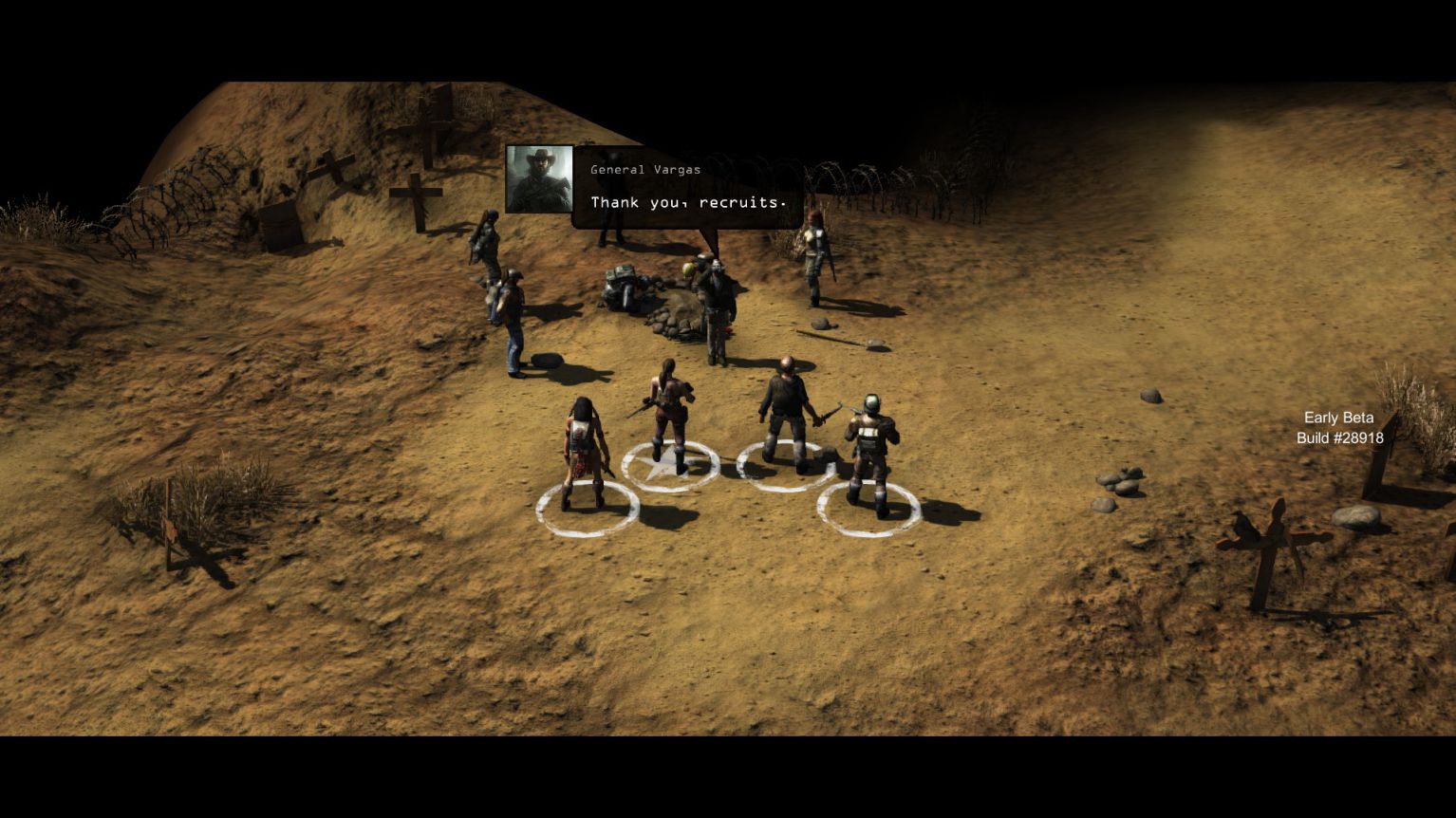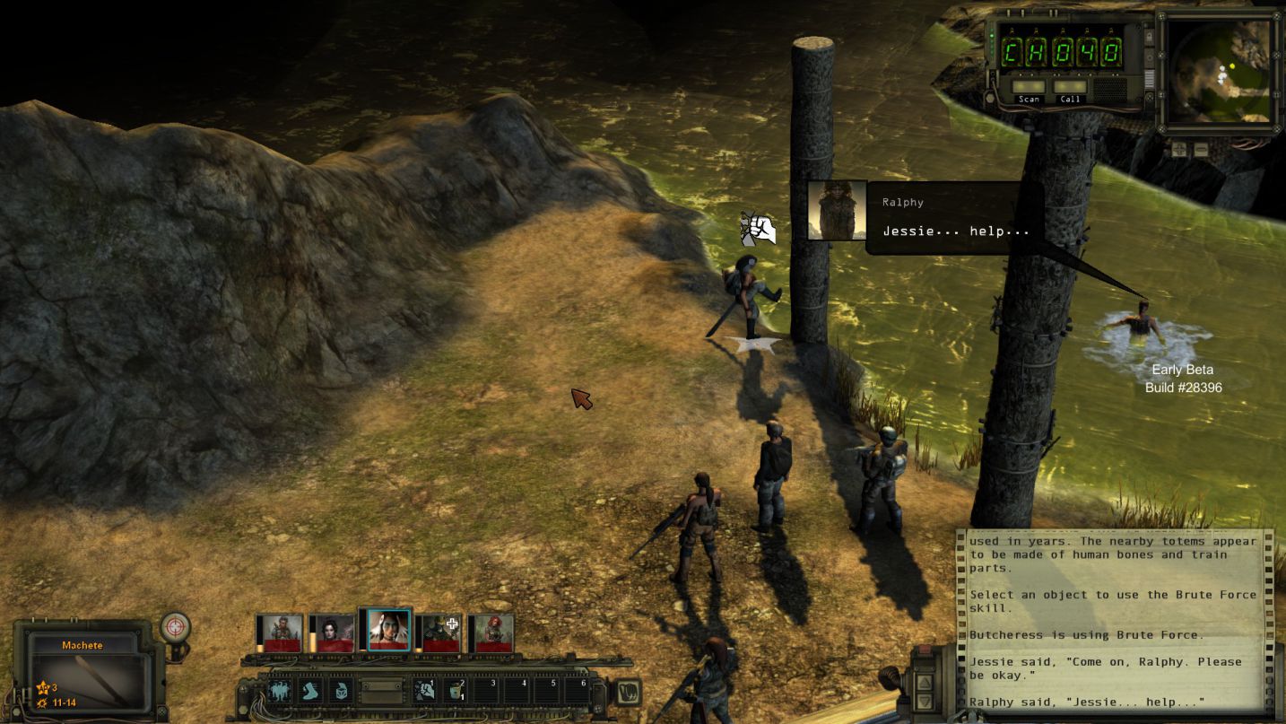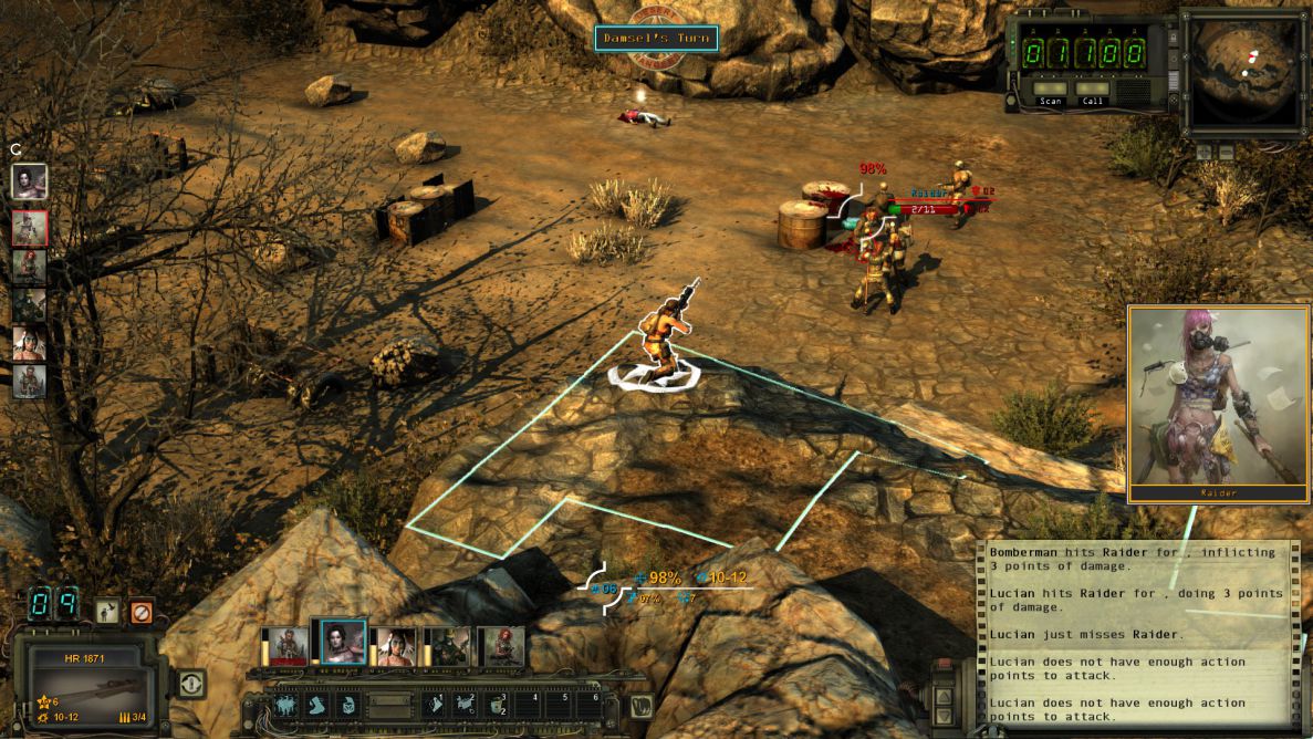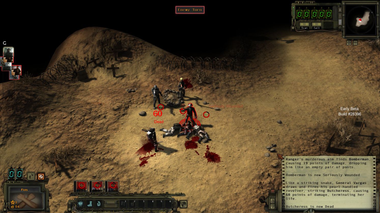 戰鬥方面,遊戲給予了三種預設難度(新手、老手、遊俠),而戰鬥開始時是由每個人的Combat Initiative來決定先後順序及回合速度,當你的Combat Initiative比別人高時,你可能連動使出紅色三倍速 三回合 (當然不常見,但目前版本的CI數質太過不平衡)。而每一回合是依照角色的Action Point來進行移動與攻擊。每種槍枝或武器都不同,有些能用多一點AP與子彈換取更多傷害力,也有在近距離時喪失準心的可能性。因為是遊戲初期,加上在Beta狀態下,敵人的AI並不會有太變化,但他們也是會瞄準你薄弱的狙擊手,找掩護地點及在無法攻擊你狀況下施行襲擊(Ambush)技巧,讓下一個移動到射擊範圍內的人瞬間吃子彈。在遊俠難度下,一般戰鬥也是有可能全滅的。而在裝備方面,子彈在末世並不多,需要小心使用。