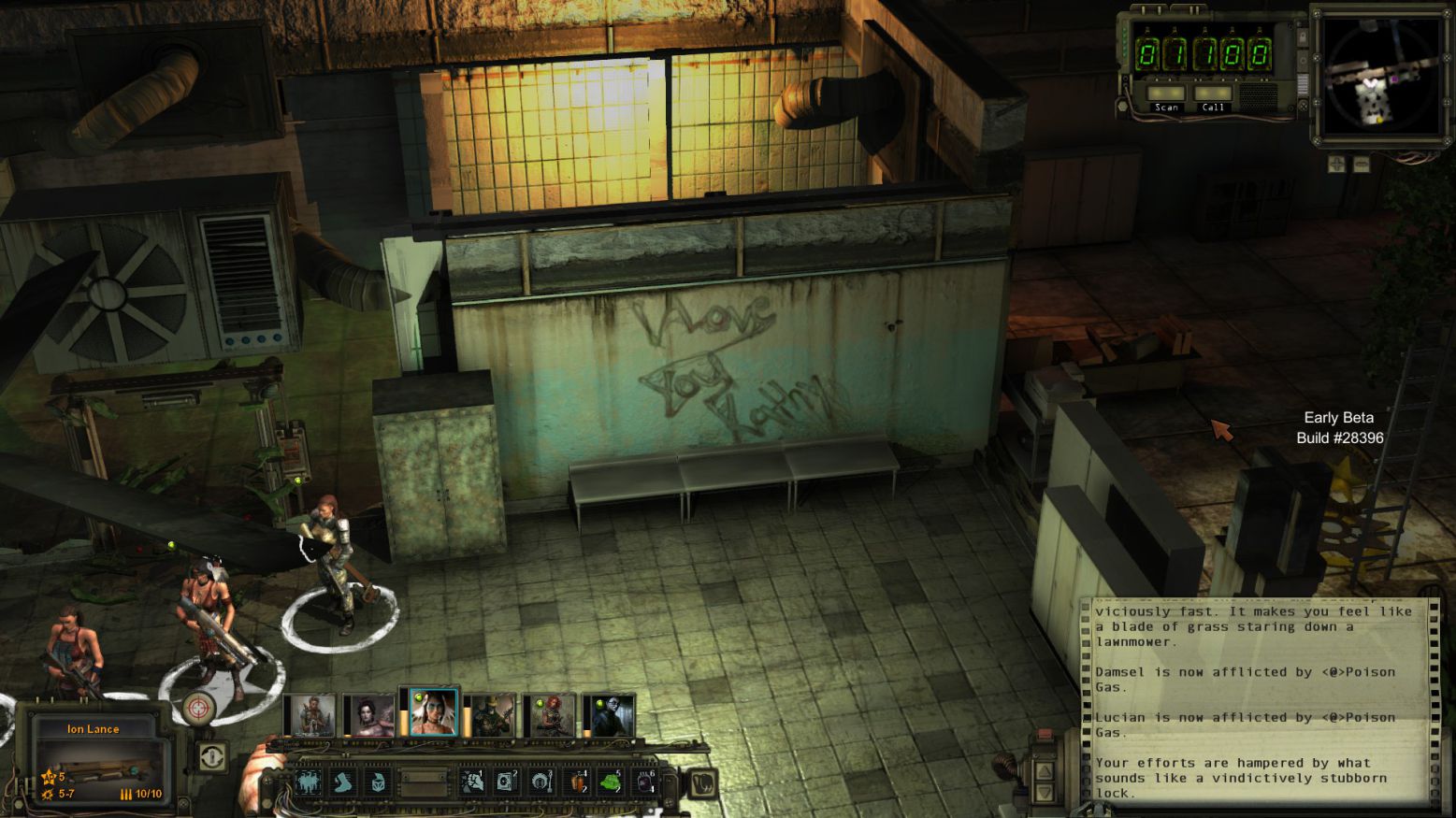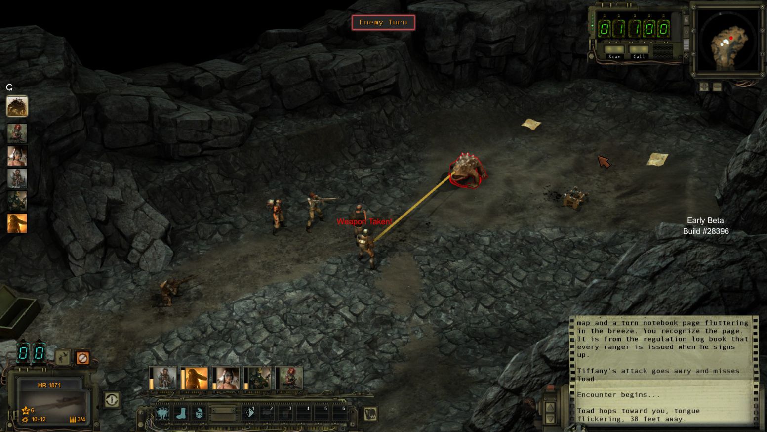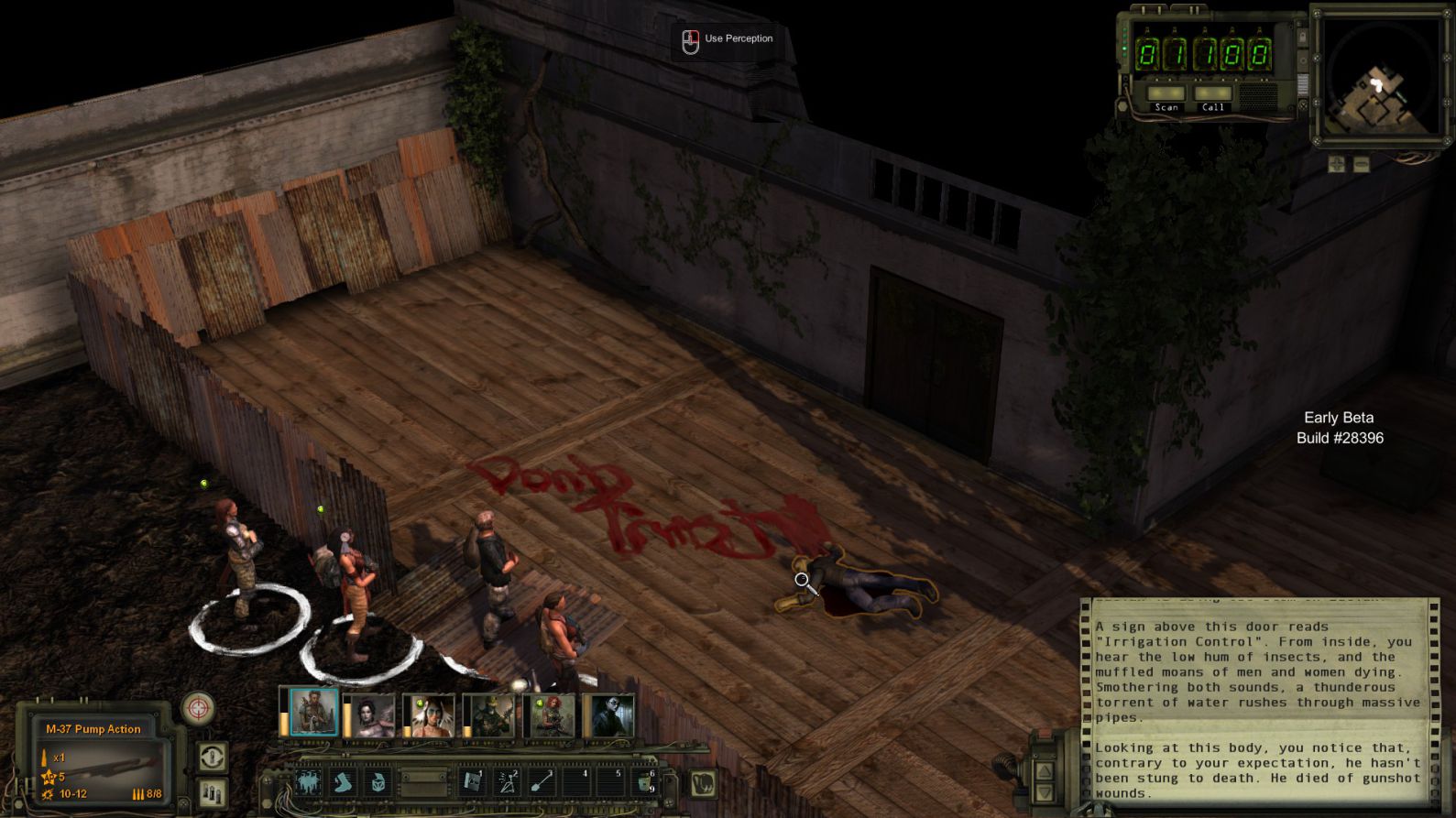 戰鬥方面,遊戲給予了三種預設難度(新手、老手、遊俠),而戰鬥開始時是由每個人的Combat Initiative來決定先後順序及回合速度,當你的Combat Initiative比別人高時,你可能連動使出紅色三倍速 三回合 (當然不常見,但目前版本的CI數質太過不平衡)。而每一回合是依照角色的Action Point來進行移動與攻擊。每種槍枝或武器都不同,有些能用多一點AP與子彈換取更多傷害力,也有在近距離時喪失準心的可能性。因為是遊戲初期,加上在Beta狀態下,敵人的AI並不會有太變化,但他們也是會瞄準你薄弱的狙擊手,找掩護地點及在無法攻擊你狀況下施行襲擊(Ambush)技巧,讓下一個移動到射擊範圍內的人瞬間吃子彈。在遊俠難度下,一般戰鬥也是有可能全滅的。而在裝備方面,子彈在末世並不多,需要小心使用。