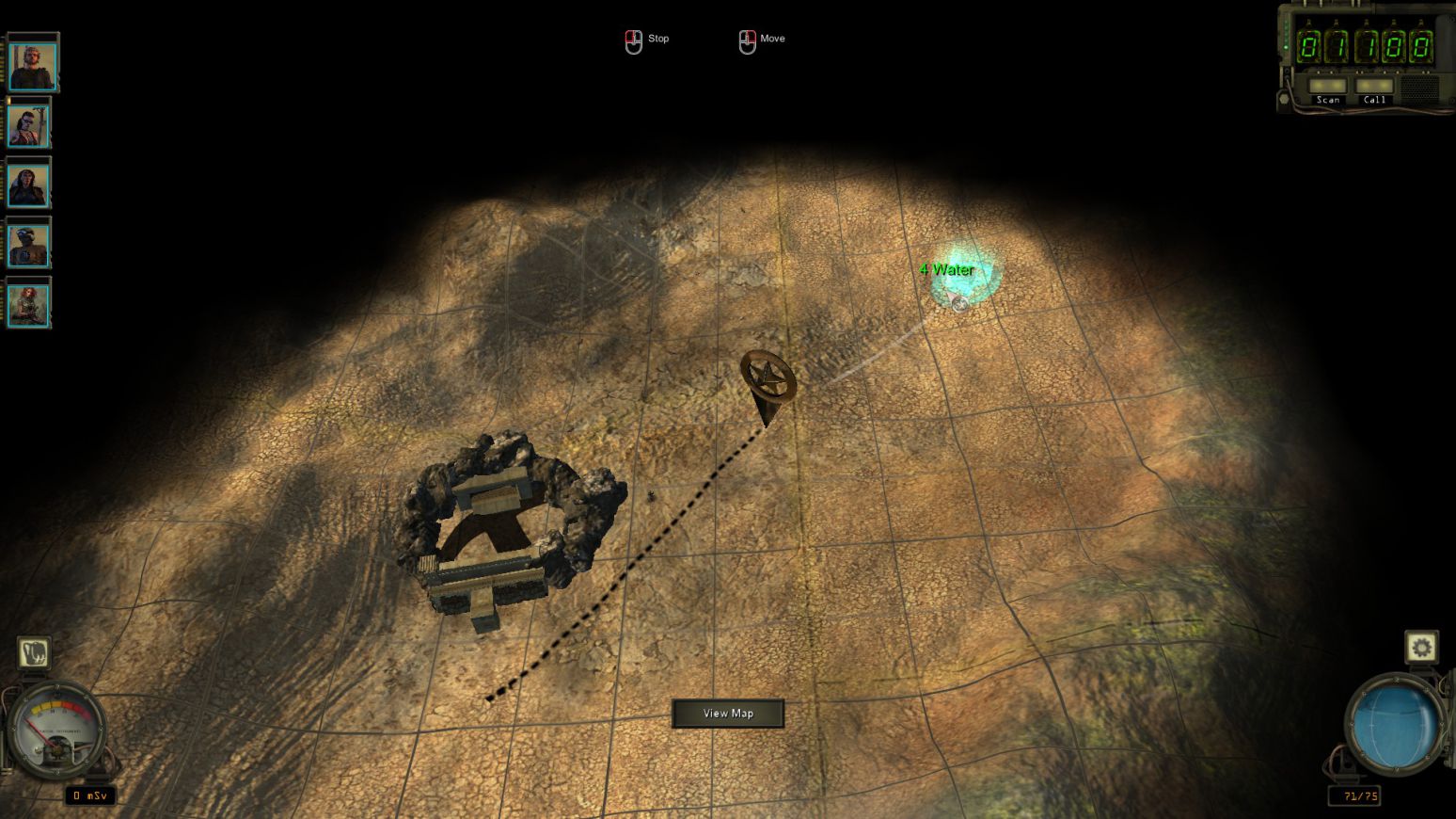 遊戲是以大地圖方式行走,自由地來發覺城鎮、寶物與一些隨機遭遇事件...當然也少不了幅射污染區...而隊伍的水資源也極為重要