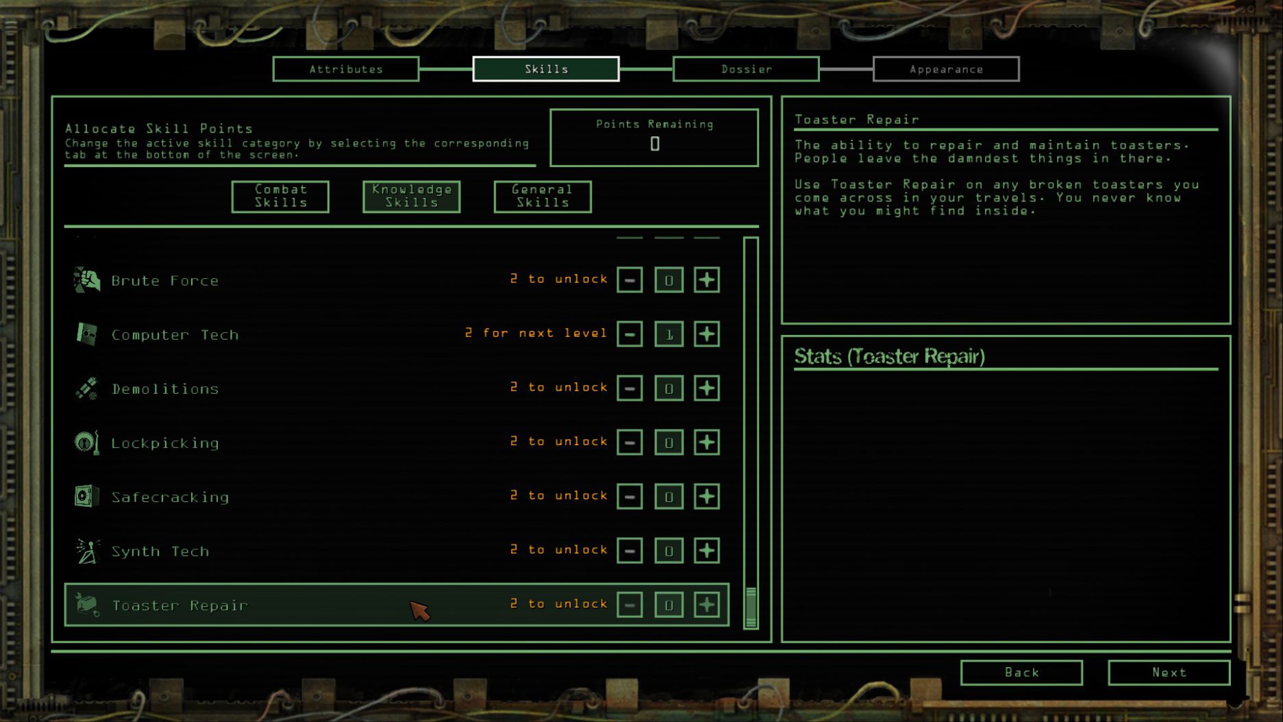 在《Wasteland 2》中,當然少不了 龍與地下城 那類戰鬥之外的技能。與對話相關的技能有三種,名為澳客(Hard Ass)、拍馬屁(Kiss Ass)、耍嘴皮子(Smart Ass)。遊戲的對話系統為關鍵詞系統,由玩家選擇該有的關鍵詞來進行對話,其中也有類似舊型RPG一樣自行打入其他NPC提到的關鍵詞來了解更多事實。而觀察技能更能於對話前發覺周圍及NPC的異狀,進而發問與掀開底細。