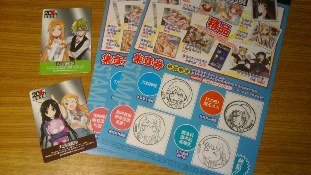 最後是今天出門去順路經過去兌換的動漫節大電擊文庫展相關集章活動的贈品,一份可以兌換一個禮物,現場總共有四種卡面可以選擇,除了上面看見的兩個外,只記得有一個是夏娜與茵蒂克絲,當初還想說這兌換的東西會是價值在 NT$50 上下的小東西,結果 ...