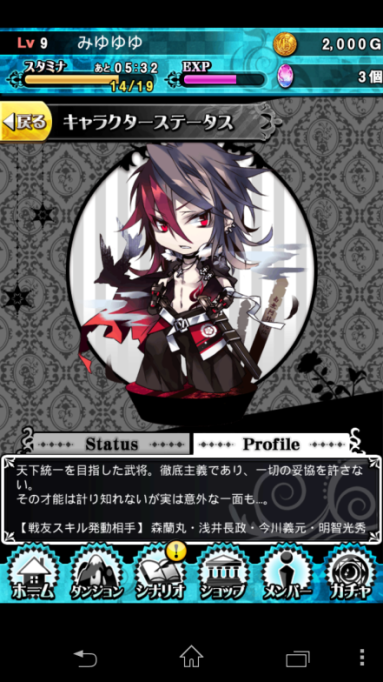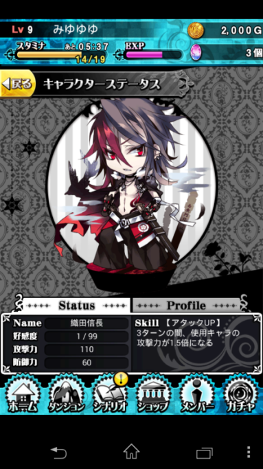 個人資料:玩家名稱(於此更改)、等級、ID、密碼(於此更改)、好感度(自己過完關卡後會得到,用來提升卡牌們的好感度)