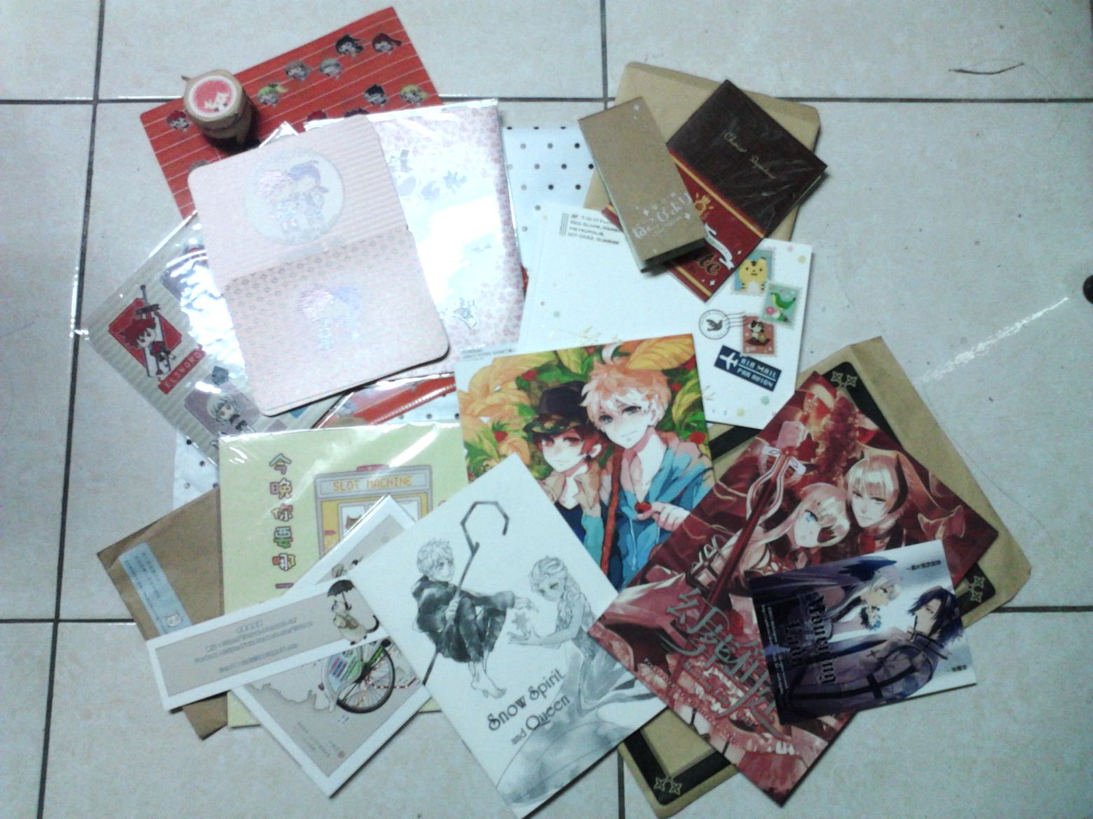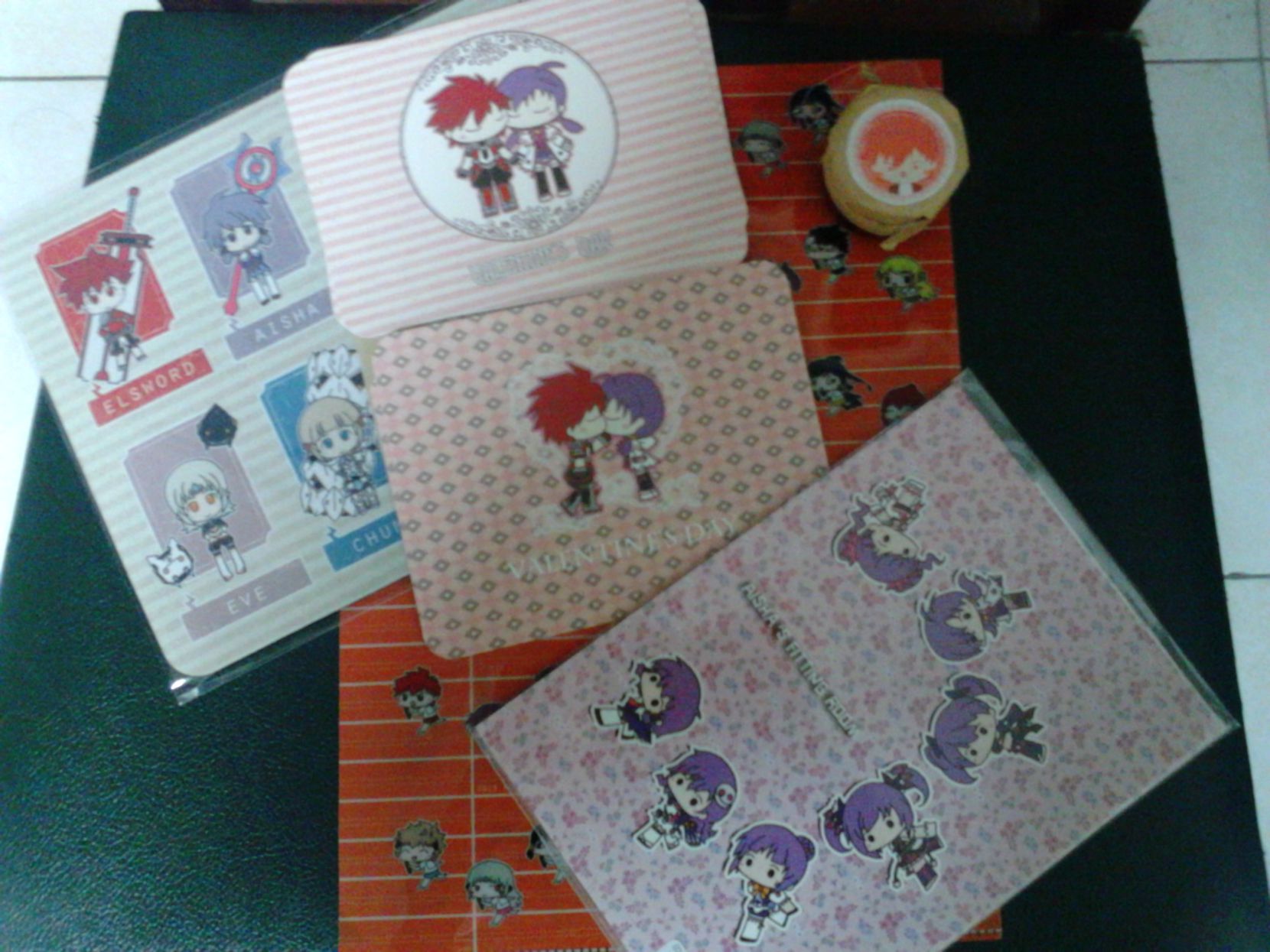 從最左邊開始是滑鼠墊,中間是送的情人節明信片:騎領x元素 情人節紀念明信片,一共四張兩種圖案,旁邊是限定送的小果醬,下面是愛莎限定(私心)本:AISHA'S FITTING ROOM,最下面墊著的是消費滿200元送的資料夾:艾爾全員跑步資料夾。