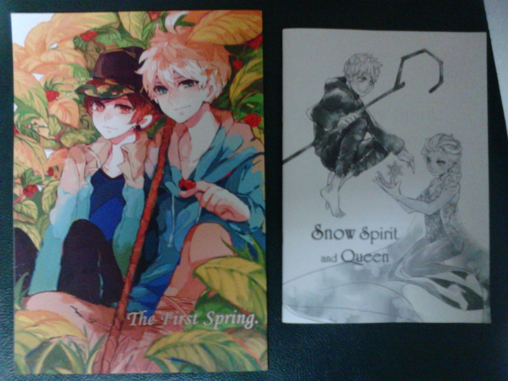 左邊是蜜子大大的捍衛聯盟傑克與傑米的同人本:The First spring.右邊是炎緋大大的傑克X艾莎混合同人本:Snow Spirit and Queen。