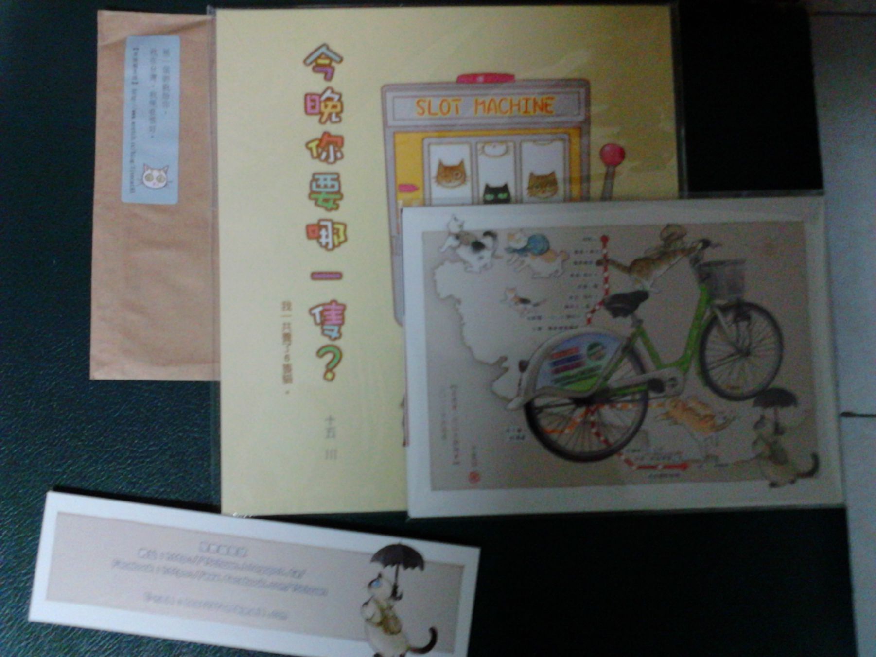 這攤的商品就這幾個,左邊是寵物漫畫本:今晚你要哪一隻?右邊是明信片:【台灣一偶貓】明信片系列-B組。