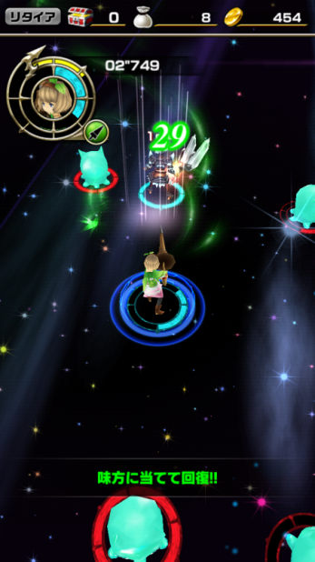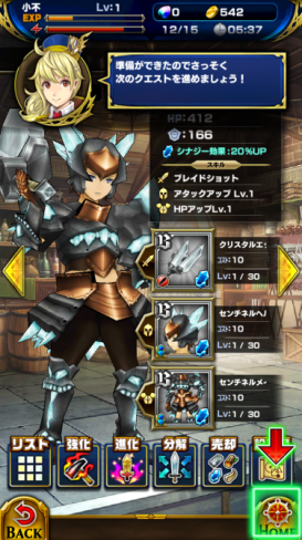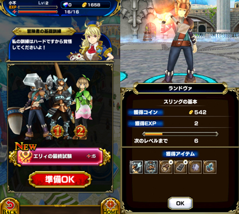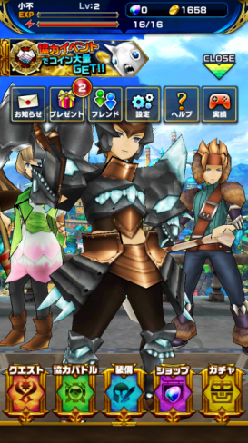 以下是遊戲的主畫面,選擇完主角後,遊戲還會配給玩家另外兩個角色一起陪你戰鬥。下排五個icon由左至右分別為:關卡選擇、協力戰鬥、裝備、商店、寶石抽。