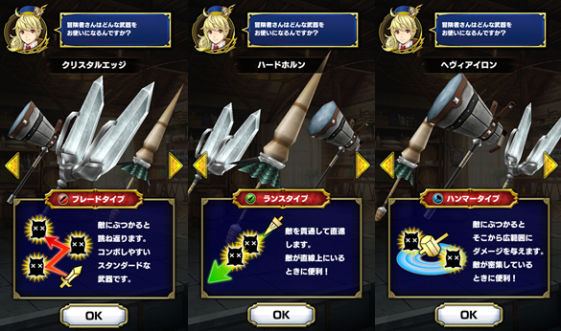 角色創建完後,就選擇初始武器,每種武器的攻擊方式有不同。第一種是雙劍(反射式攻擊)、第二種是槍(穿透式攻擊)、第三種是錘(範圍式攻擊)。選擇完畢後,之後還是可以更換武器的。所以選擇你喜歡的就可以開始冒險囉!
