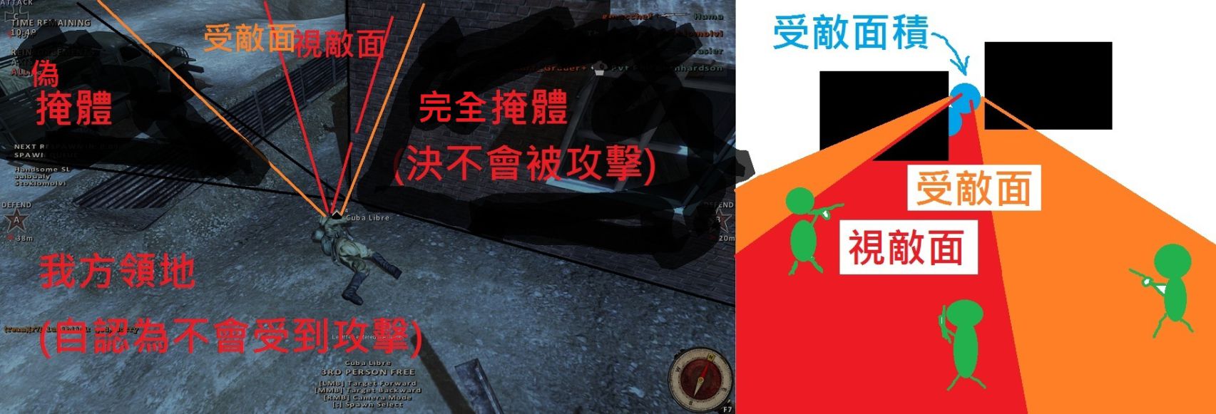所以 盡可能的讓 視敵面 趨近 受敵面..避免被沒在視野內的敵人殺死(側面殺).
