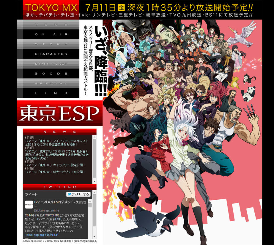 由日本漫畫家 瀬川はじめ 在「月刊少年ACE」上連載的作品《東京 ESP》,在 2013 年 5 月宣布動畫化,預定夏季播出。今(4)日,動畫官網重置,並公開主視覺圖、製作團隊、配音名單以及人物設定等詳細資訊。