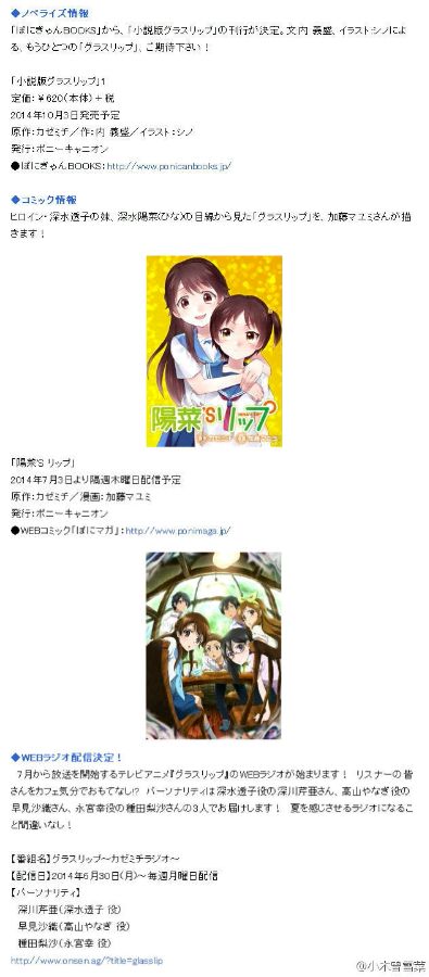 知名動畫製作公司P.A.WORKS預計於2014年7月播出的原創動畫《Glass Lip》,最近釋出了多項情報,包含有網路首播的時間、小說版、漫畫版、以及廣播節目等相關消息。