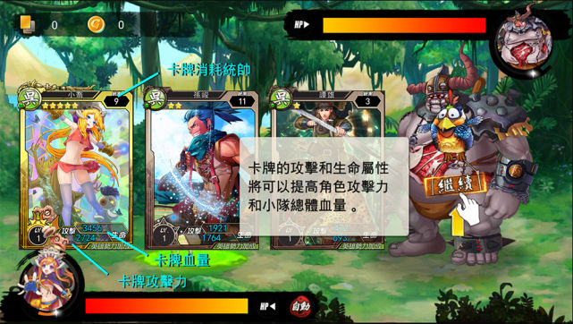 每位角色所攜帶的三張卡片,都直接影響了該名角色的血量與攻擊力,三張卡片的總血量與總攻擊力,就是該位主角的素質。此外每一張卡片都擁有不同的技能與發動概率,包括回復血量、短暫增加攻擊力、增加隊長怒氣值、對敵人施以定身等等。