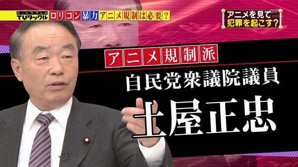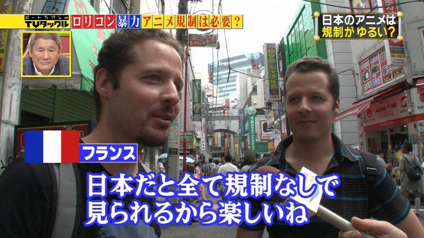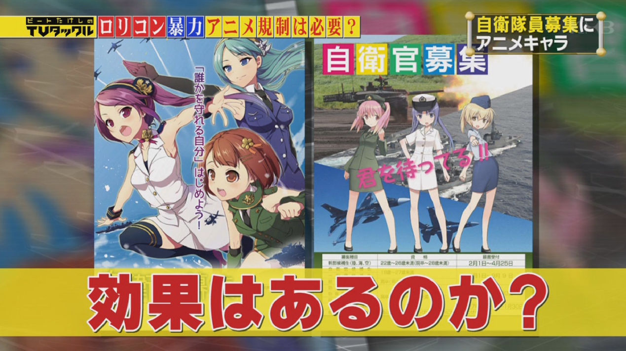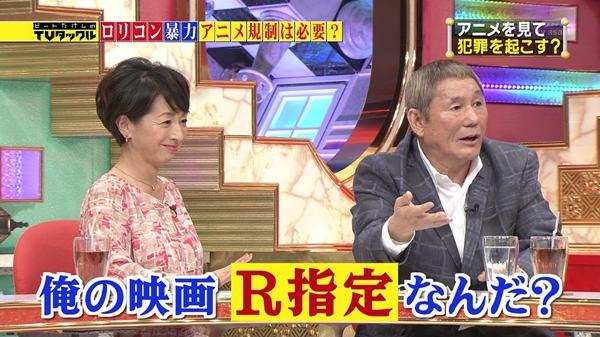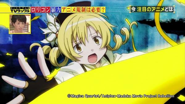 在昨(1)夜於日本朝日電視台所播出的談論節目「北野武的 TV 擒抱(ビートたけしのTVタックル)」,探討了動畫有無規制的必要性,節目集結了政治家、心理學家、漫畫家、御宅之王(岡田鬥司夫)、記者等人來對這個議題進行討論,談論的同時也引用了不少動畫作品,例如:《魔法少女小圓》、《進擊的巨人》等。