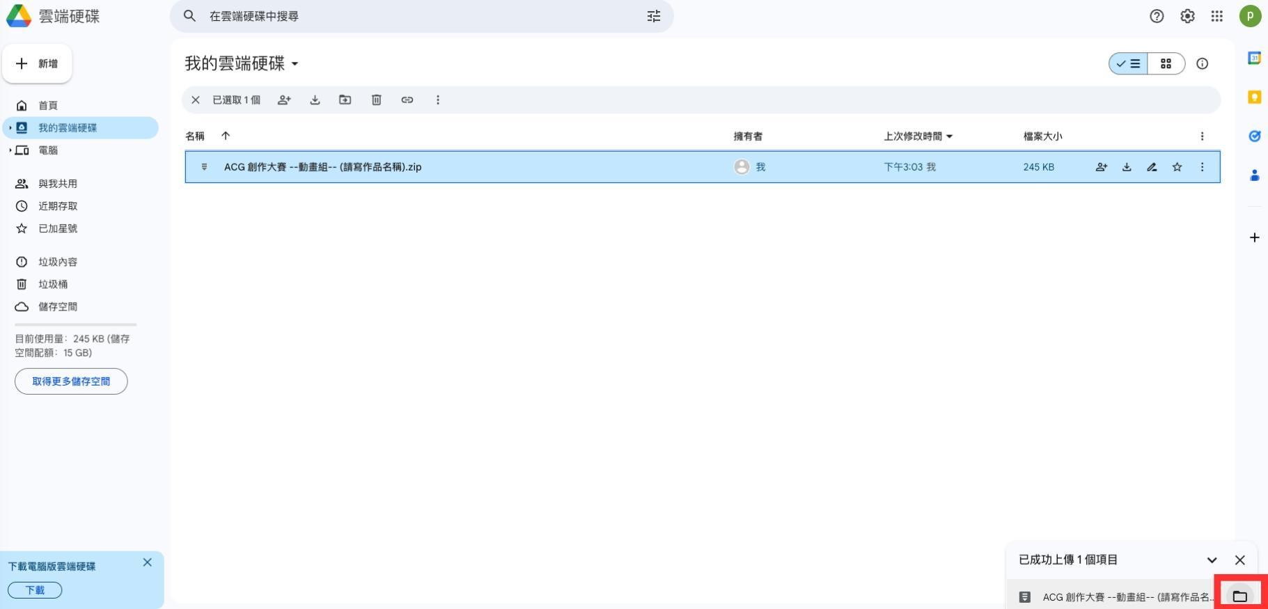 6.開始上傳後右下角會有進度訊息框,待作品上傳完成後會出現「綠色√」代表上傳完成,(作品檔案大小及網路上傳速率可能影響上傳完成時間,敬請耐心等待。),完成後請點擊紅框中檔案圖示顯示作品壓縮檔位置。