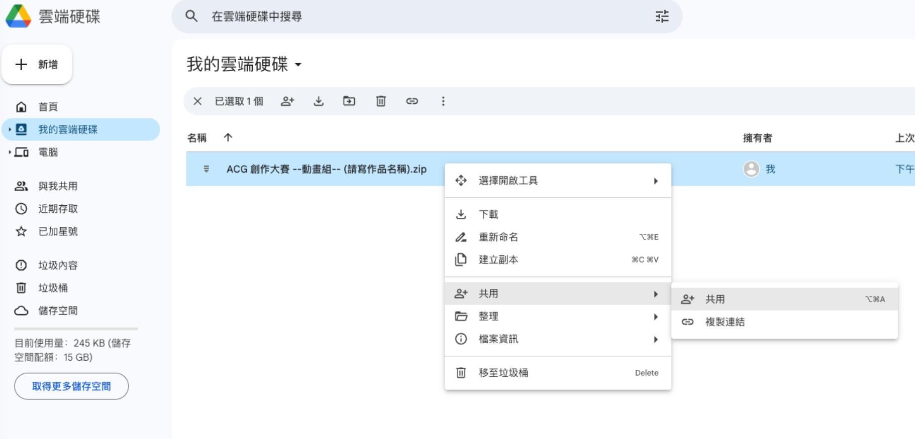 7.選擇作品壓縮檔,點擊滑鼠右鍵,點選「共用」。