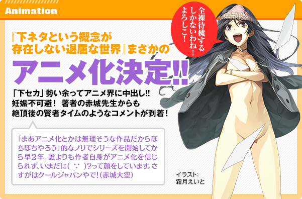 由 赤城大空 著作、霜月えいと 插畫,並於「ガガガ文庫」發行的輕小說作品《下流梗不存在的灰暗世界》(尖端代理),於今(17)日宣佈動畫化決定的消息。