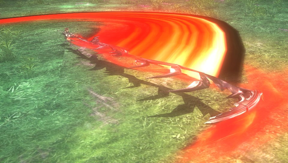 R+□的特殊攻擊「ラウンドファング」咬刃將以最大的距離展開,大約是基本的兩倍距離下進行多段劈斬接著在體力足夠的狀態下持續按□可以達到連續攻擊。