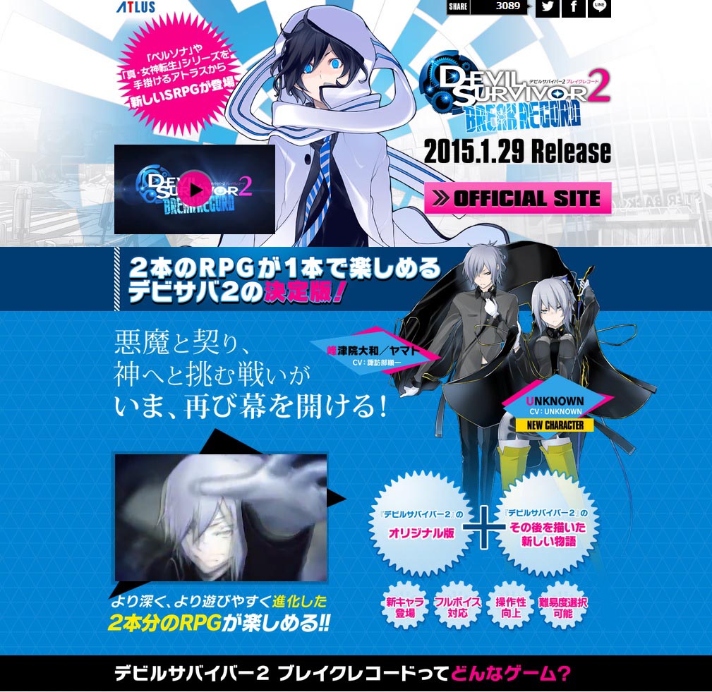 ATLUS 今日(2014年10月24日)釋出預計於2015年1月29日發售的 3DS 遊戲「惡魔求生者 2 BREAK RECORD」四個宣傳影片,影片中介紹了與夥伴的溝通、與敵人的戰鬥場景以及召喚惡魔的方式。