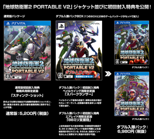 由 D3 PUBLISHER 開發預計於2014年12月11日發售的《地球防衛軍 2 攜帶版 V2》近日公佈初回特典及店鋪特典。另外也公佈了初回限定「雙人入伍包」內含兩款遊戲的組合,售價6980円不含稅。