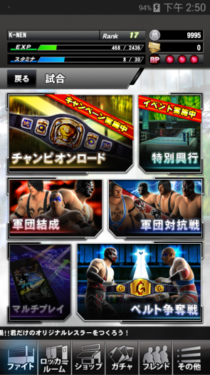 在ファイト頁面中可以看到各樣的比賽,主線的冠軍之路就訴說玩家如何從新人摔角手慢慢爬上摔角明星,而在特別興行中可以進行每日特殊比賽或者官方舉辦的連動的賽程哦。