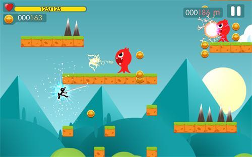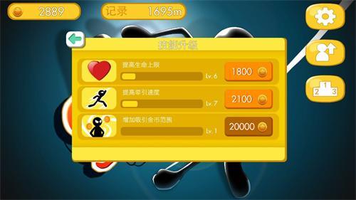 遊戲沒有體力限制,如果game over還可以重新繼續玩,這就滿足了玩家多次體驗遊戲的機會。另外值得注意的是,當火柴人越跑越遠,火柴人奔路速度就會變快。金幣能用來升級技能(提高生命上限、蜘蛛絲牽引速度、增加吸引金幣範圍)和購買各種幫助玩家的遊戲道具。