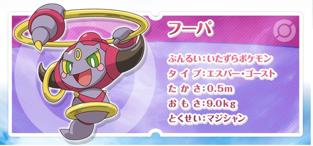 フーパ是第六世代(X.Y.終結紅寶石.初始藍寶石版)的隱藏幻之神奇寶貝之一,隨著電影標題的公布,牠也被正式透露了。設定上牠擁有利用圓環穿梭次元及傳送東西的能力,而在牠背後究竟還隱藏著怎樣的秘密呢......?