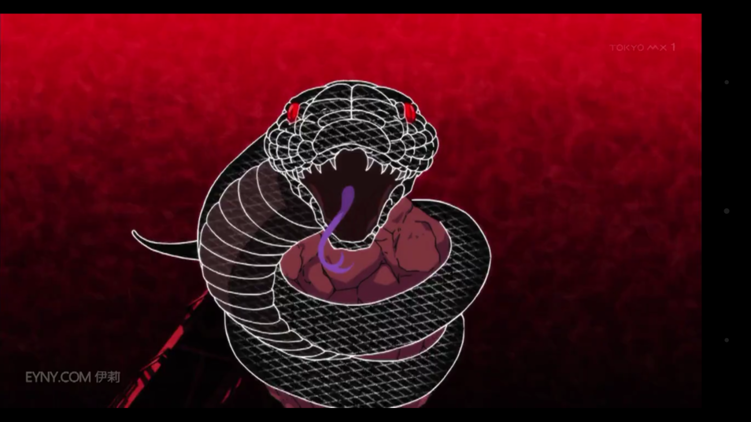 黑亮的鱗片爬滿全身,猩紅的蛇瞳像是在盯著什麼,牠張大著嘴巴,伸出紫色的蛇信。