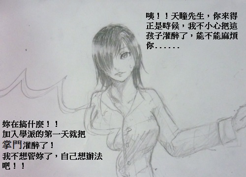 「說得有點道哩,是我不夠冷靜,抱歉。」天瞳推推眼鏡「主要原因是你剛剛的舉動和我們掌門太過相像,讓人有些火大。」