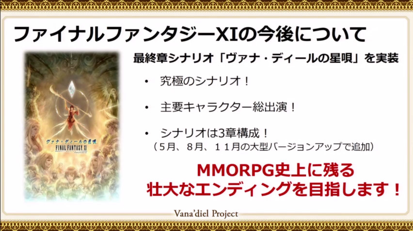 Square Enix表示:這個資料片是在2002年Final Fantasy XI發表後後集大成的資料片,同時,我們會將這個資料片分三段時間做更新。分別是在2015年的5月、8月和11月。並且會加入許多新的內容。而這也是FF XI最後的一個資料片,也是本作品的最終章。