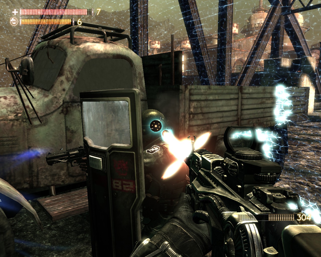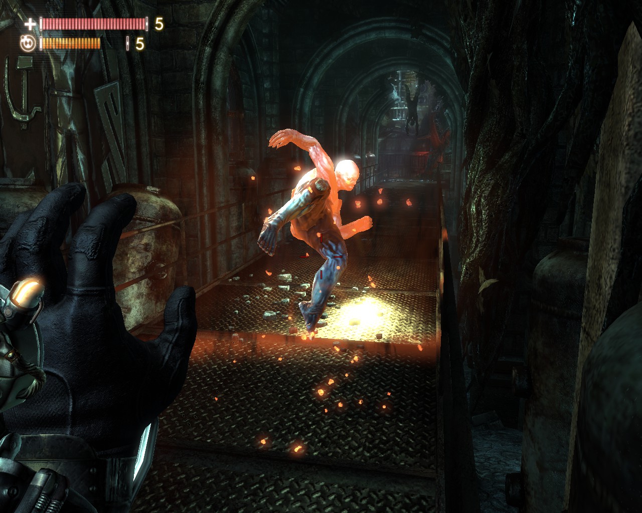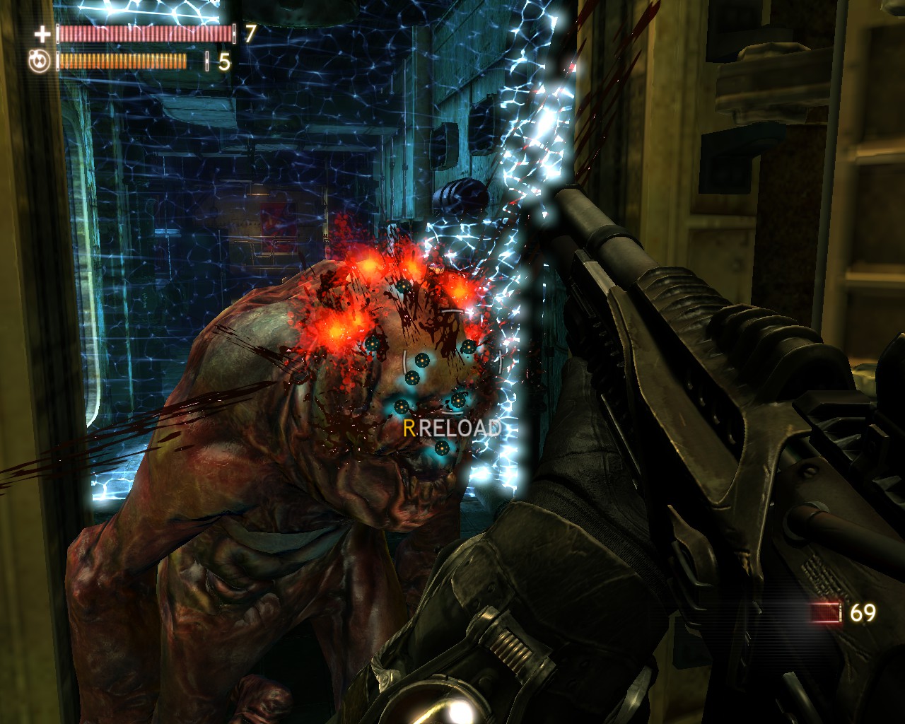 TMD理所當然的也能運用在槍戰上,類似《生化奇兵》或者《黑暗領域》般的異能槍戰,除了開火射擊以外,還能利用TMD左右戰場,舉凡衝擊波、時間停止力場、直接老化敵人等等,槍戰體驗別有一番趣味。武器種類則較為陽春,手槍、步槍、散彈、狙槍,不過都充滿科幻風,外觀花俏精美。敵人類型也富有變化,人類敵人如一般戰鬥員、防暴盾、狙擊手、鏈砲重甲兵、飛彈兵,怪物也有數種不同類型,愈後期愈棘手,也有幾場大怪物BOSS戰。