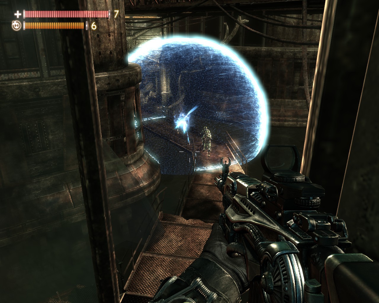 ▼在力場內直接繞到盾兵側面爆頭,連射出的子彈都清晰可見