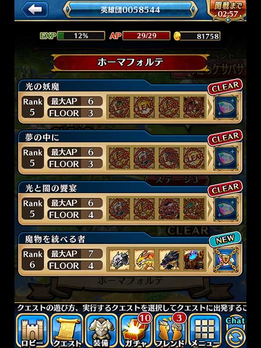 每個關卡會標出消耗AP與回合數,右邊則是在關卡中有遇到指定的全部怪物的話,則會送一顆鑽石!