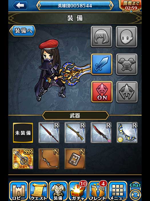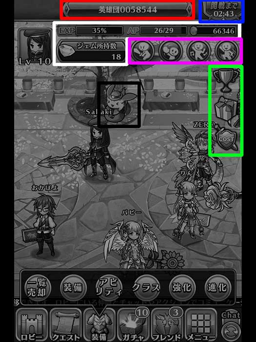 黑色框框:此遊戲的吉祥物,點擊他過幾小時後會幫你帶一些素材、經驗、熟練...等等的東西回來,也可以花費鑽石用更短時間且帶回來的素材也更好。