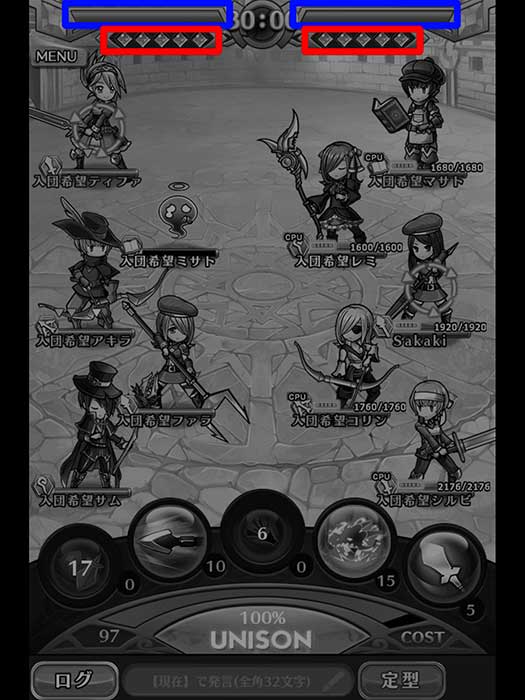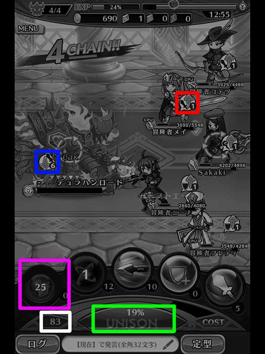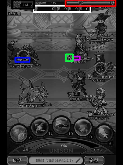 綠色框框:表示目前UNISON能量,每使用技能或被攻擊都會增加UNISON能量,集滿後可以發動招喚。