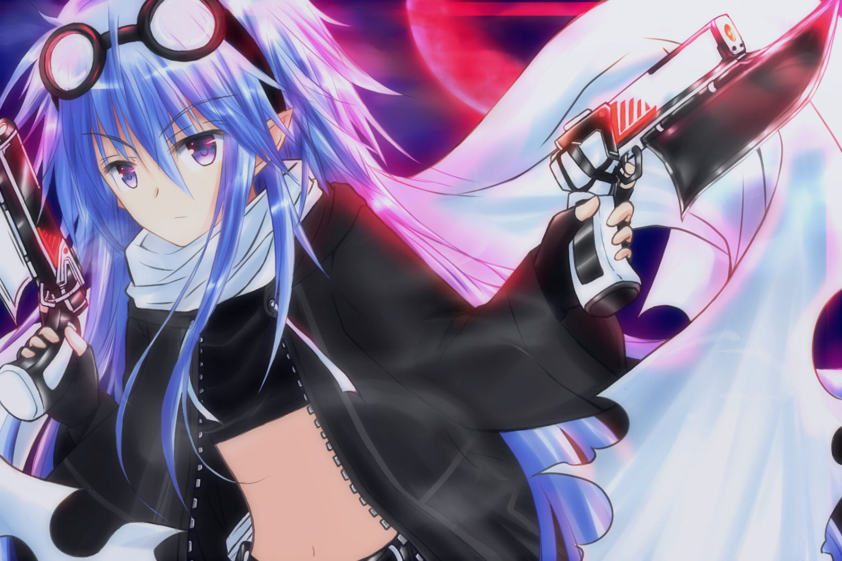 外表形容:一頭淡藍色的長髮,頭上帶著護目鏡,圍著白色的圍巾,穿著灰黑色蝙蝠頭型的連帽長外套,內搭黑色的無袖高領短上衣跟白色的短褲。