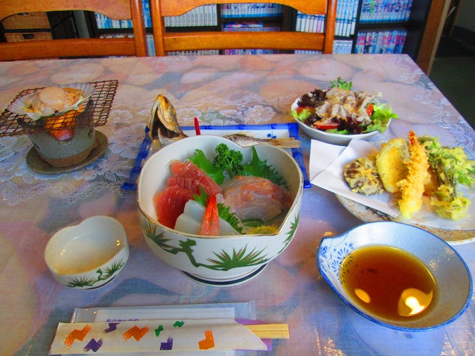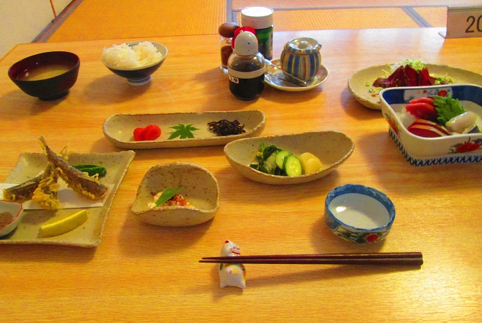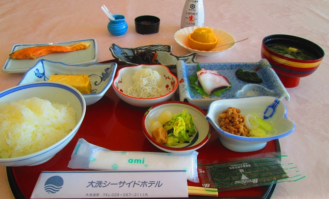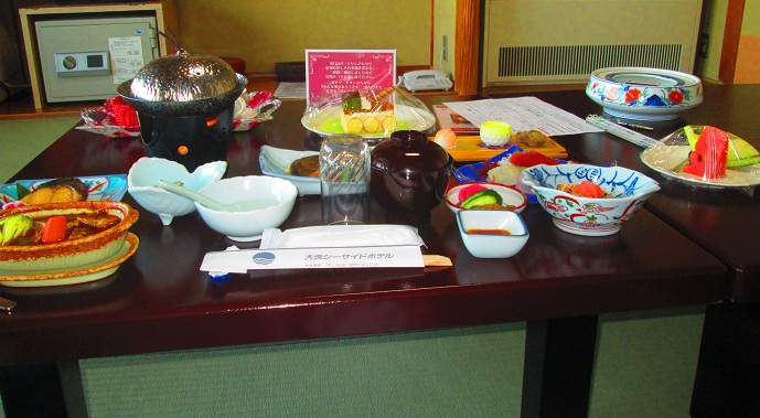 燉牛肉 ,鰤魚 ,常陸鍋 ,甘露煮魚 ,戰車蛋糕 ,鰹魚 ,生魚片 ,蝦壽司 ,豆腐 ,煮牛蒡 ,水果 ;