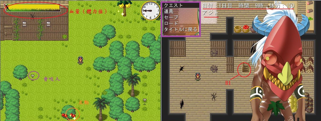 左上黃色的是體力條,(紫圈)動物、昆蟲都是敵人必需避開,(橘圈)亮亮一閃一閃是可以 互動的點,(紫方塊)選單由上而下是任務(提示)、道具欄、存檔、讀檔、目錄,B1是女主角們被成功補獲後居住的地方~