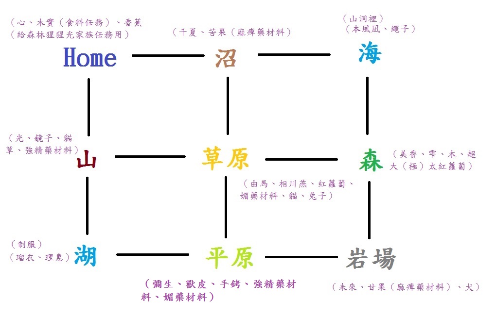 機)(繩子)、美香(要先在山區拿到貓草不然無法靠近)(魚-貓)、理惠