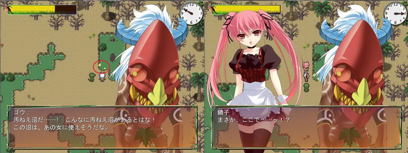 鏡子:她會在玩家成功補獲雫後才會出現,在山區(如圖示)看到她時,會先逃跑,在同地圖右上角的樹後面就能找到她,進階任務是要玩家找到一個東西(互動點在沼澤),一樣先去探索互動點(如圖示),再回去帶鏡子來互動便完成任務。