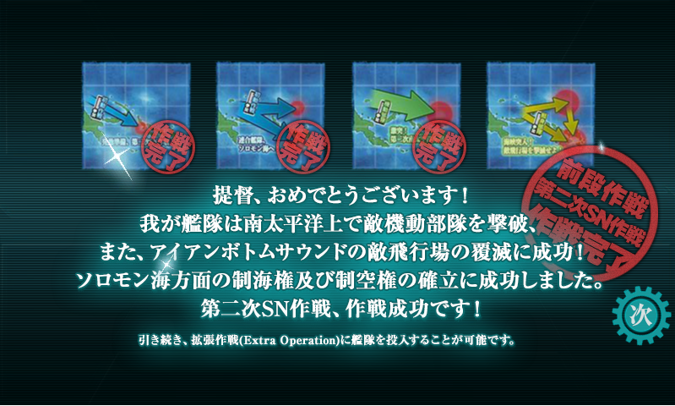 以上,本鎮守府完成第二次SN作戦前段作戰(全丙),於擴張作戰開始前進入補給階段。